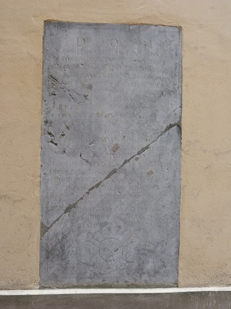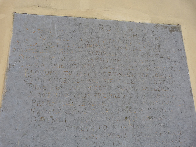Płyta nagrobna z inskrypcją poświęconą Wilhelmowi de Thorntoun Rossowi. Wilhelm Ross był sekretarzem królewskim, administratorem ceł małopolskich i pocztmagistrem poczty królewskiej.
