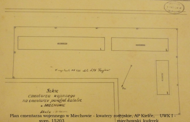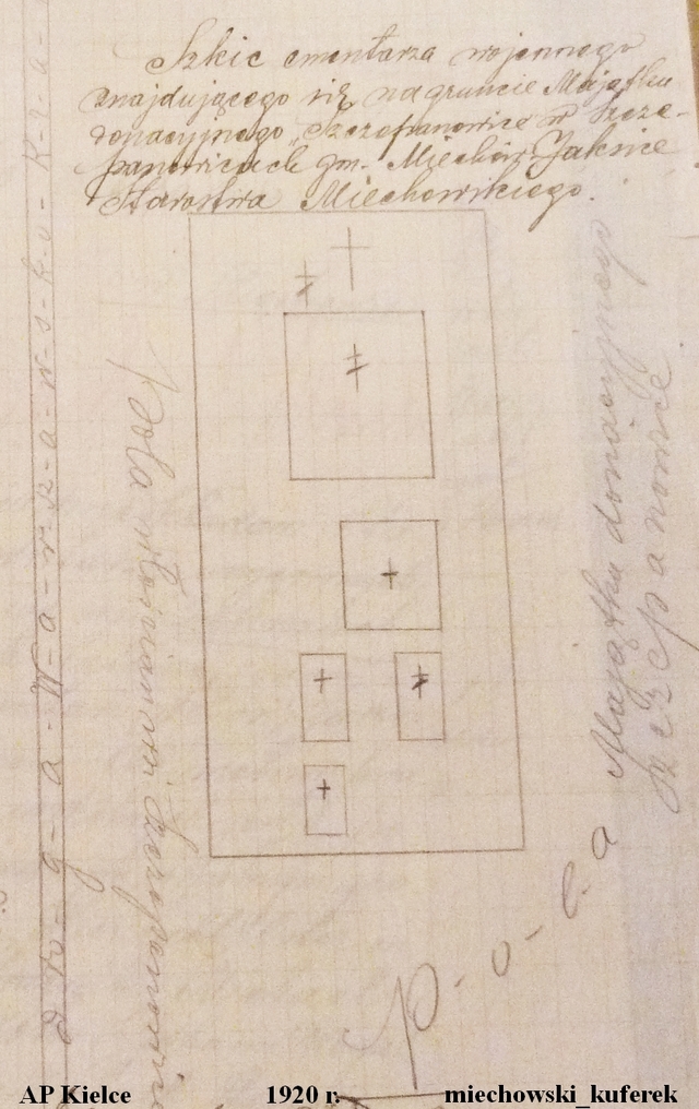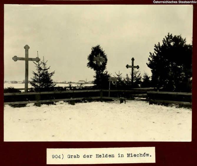Na podstawie tego zdjęcia wydano pocztówkę poświęconą 41 żołnierzom niemieckim, którzy zginęli w okolicach Charsznicy (wówczas Stacja Miechów) dnia 3 listopada 1914 roku. Napisy na krzyżu - w tłumaczeniu Jerzego Malatyńskiego zamieszczone w książce "Miechów na dawnych pocztówkach" - brzmią następująco: