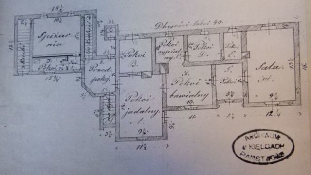 "Karczma. Ta jest w pośród wsi frontem na południe blisko rzeczki, na trakcie publicznym z stolicy Królestwa do Krakowa idącym, w miejscu do zajazdu wygodnym. Cała z kamienia miejscowego na glinie murowana, na przodzie z wystawą o słupach dziewięciu, z pułapem z tarcic, idąc zaś spod wystawy do sieni, są drzwi z tarcic, gwoździami żelaznymi przybijane, na zawiasach żelaznych z wrzeciądzem i skoblem. Dalej przez sień na prawo są drzwi także z tarcic gwoździami poprzybijane, na zawiasach żelaznych, z wrzeciądzem i haczykiem, za niemi jest izba z powałą z tarcic bez podłogi, w niej okien dwa z szybami różnej wielkości, w stanie złym, z okiennicami na zawiasach żelaznych, z haczykami żelaznymi. Z tej izby są drzwi do komory na zawiasach, z wrzeciądzem i skublem, gwoździami przybijane, w której okno jedno bez szyb, jedynie z okiennicą na zawiasach z haczykiem do zamykania.[...] Powracając do sieni są drzwi do izby gościnnej na zawiasach, z wrzeciądzem i haczykiem, z powałą, bez podlogi, w tej piec i komin z kamienia miejscowego na glinie murowane, okno jedno potłuczone [...] Z tej izby idąc na powrót do sieni są drzwi [...]."