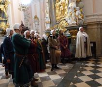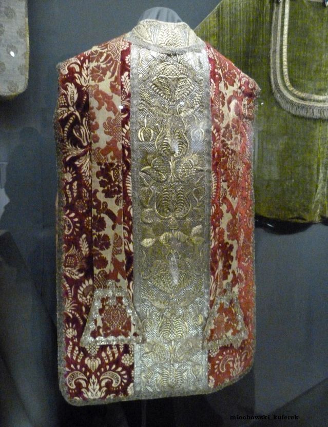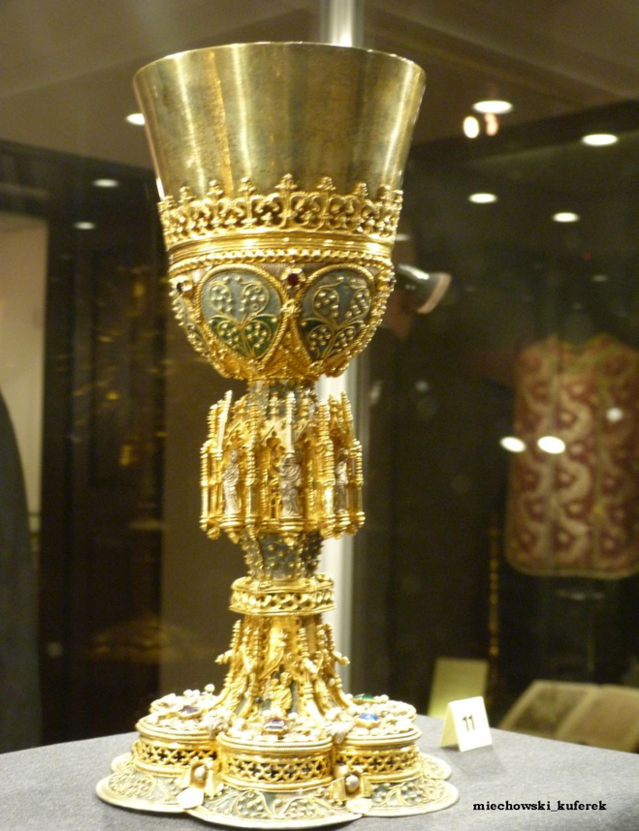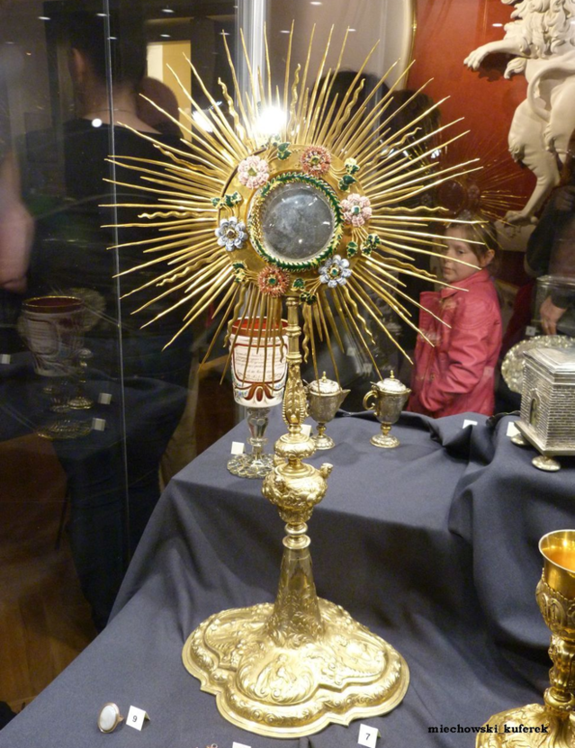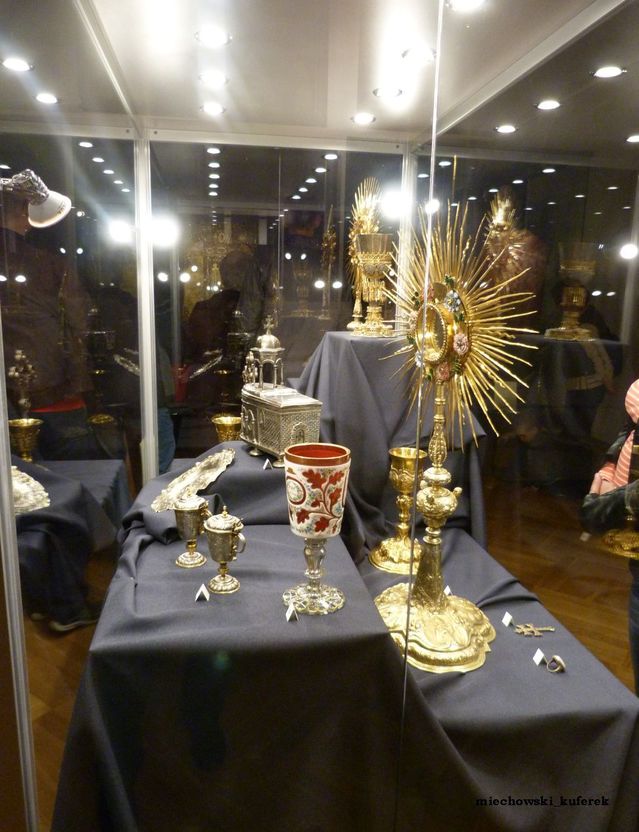 Prawie pół wieku temu o miechowskich skarbach pisał Z. Pęckowski: "Podziw budzą przepiękne, bogate ornaty, kapy i dalmatynki, których jest kilkadziesiąt, infuły prepozytów generalnych haftowane złotem, srebrem, wysadzane perłami, pastorały i inne szczegóły stroju pontyfikalnego; dalej - monstrancje, kielichy, pacyfikały, krzyże, srebrne tace, ampułki i relikwiarze, z których najcenniejszy, wykonany ze srebra w kształcie kaplicy Grobu jerozolimskiego. [...] Cennym zabytkiem jest antyfonarz klasztorny oprawiony w deski obite białą skórą, z herbem Leliwa z 1562 r. Odnaleziono w nim jeden z unikatów wielogłosowej polskiej muzyki średniowiecznej..."