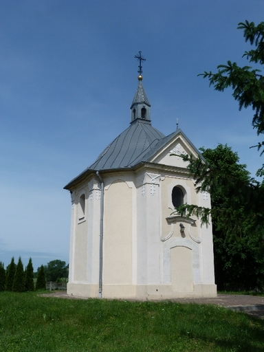 Późnobarokowa, wystawiona w 1763 roku. Obiekt murowany na rzucie koła, orientowany, z czterema niewielkimi prostokątnymi ramionami tworzącymi krzyż.