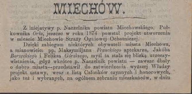 O tym, jak pilną sprawą było powstanie w Miechowie społecznej organizacji mającej na celu ratowanie zdrowia, życia i mienia mieszkańców niech świadczy fakt, że zaangażował się w nią na łamach prasy nawet sam Bolesław Prus, twierdząc, że kwotę 300000 rubli na budowę dróg należy przeznaczyć raczej np. na utworzenie ochotniczej straży ogniowej.